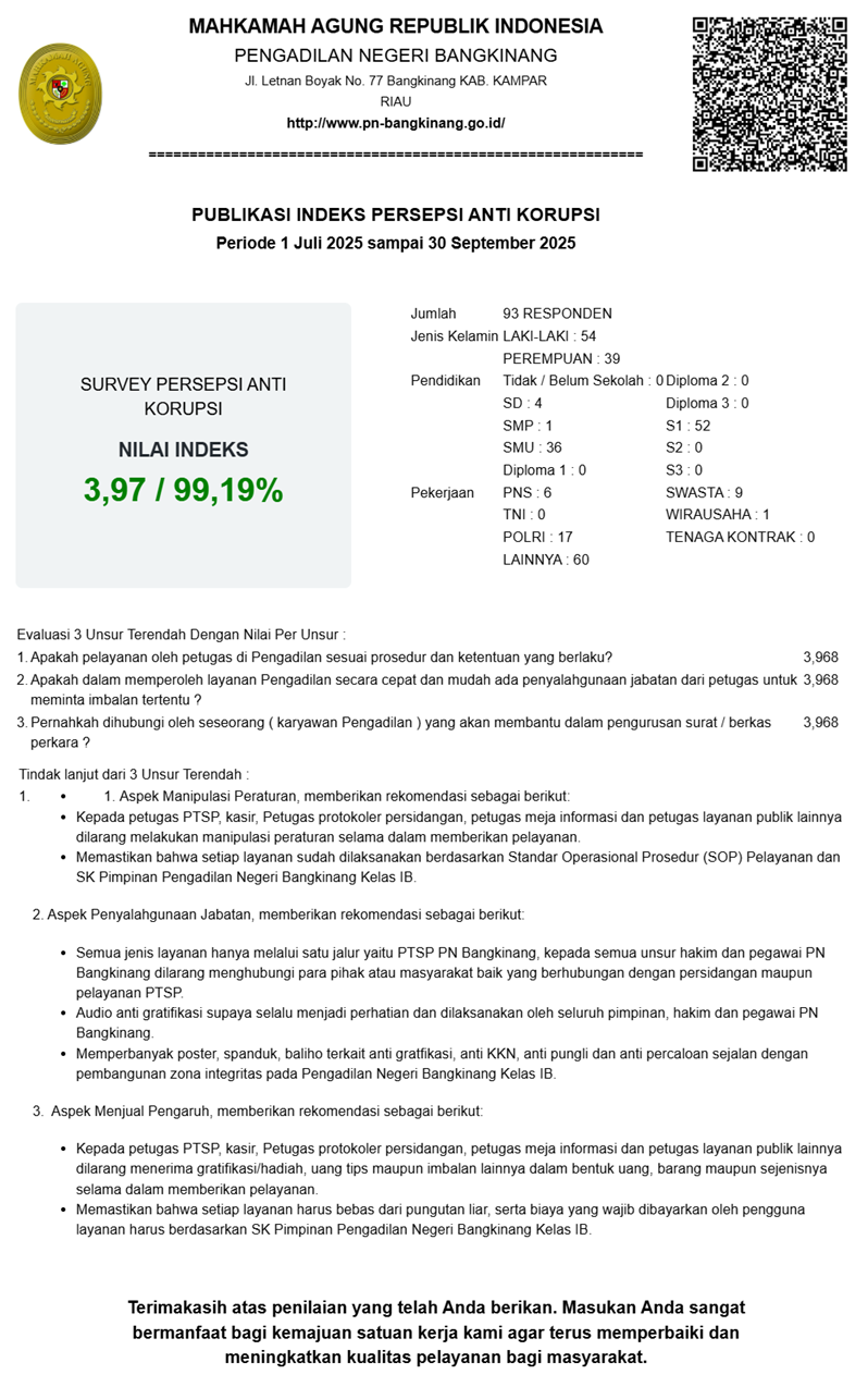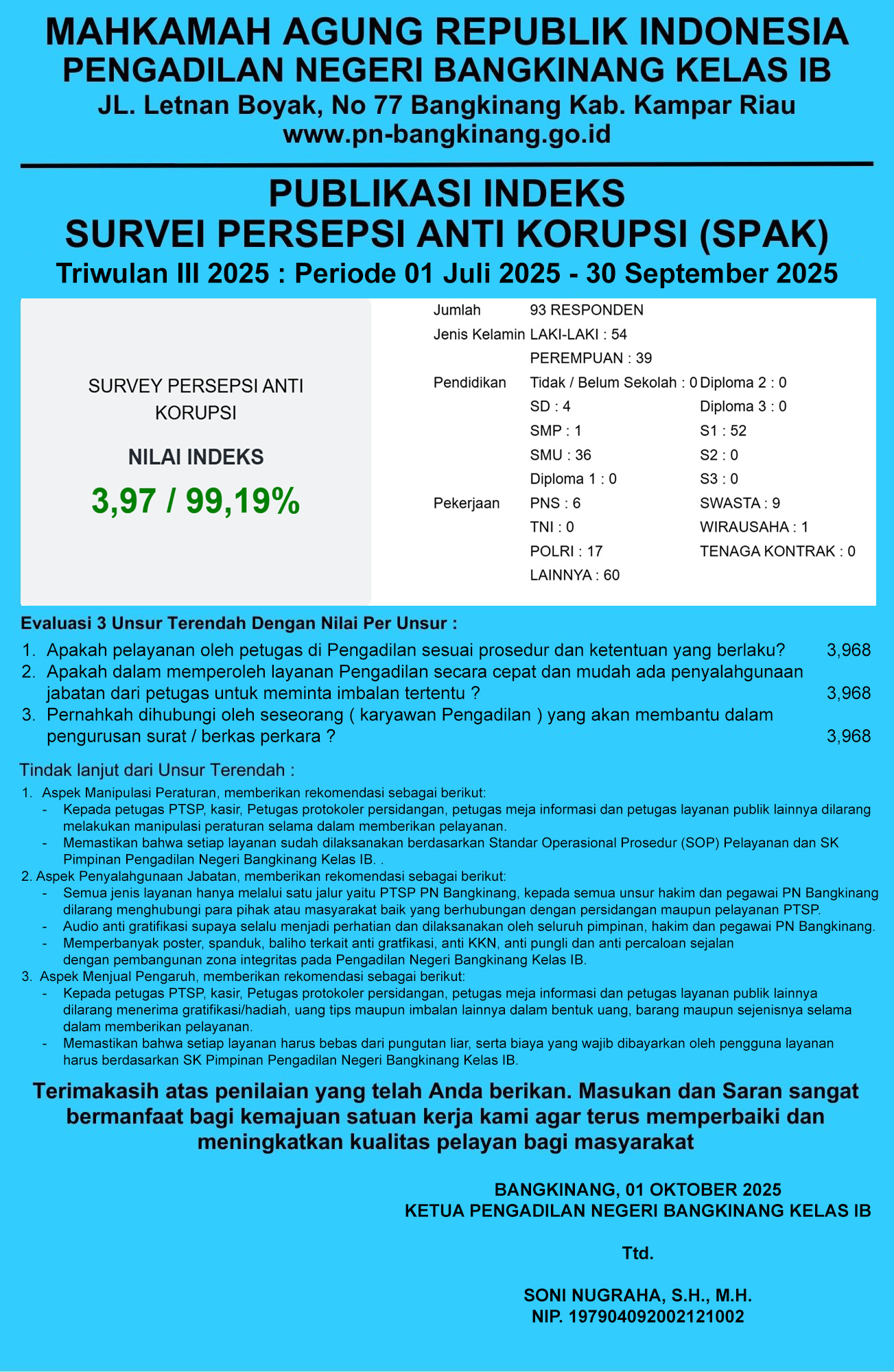 HASIL LAPORAN INDEKS PERSEPSI ANTI KORUPSI (IPAK) PENGADILAN NEGERI BANGKINANG KELAS IB |